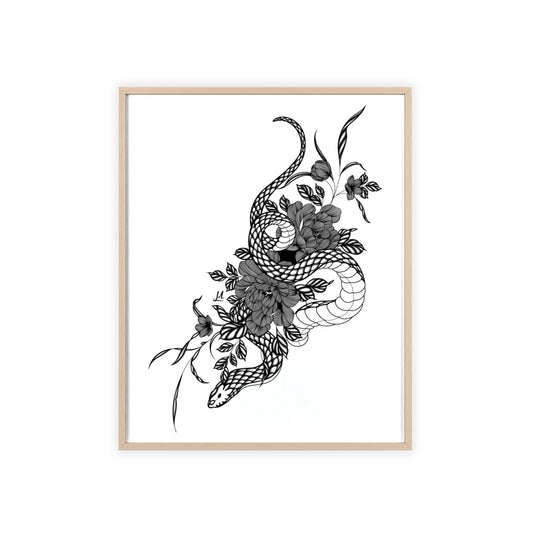 Botanical serpent wall art, in a black and white contrast shading - Framed.