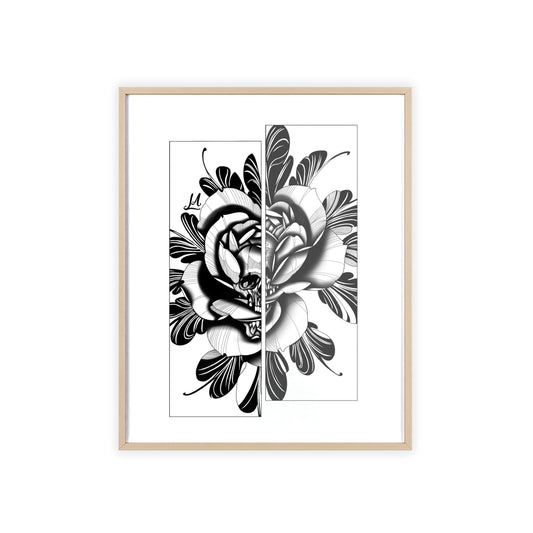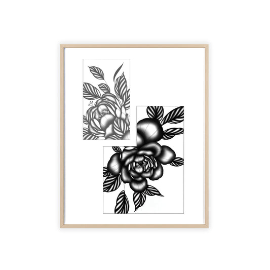 Detailed floral artwork in a black and white setting - Framed.